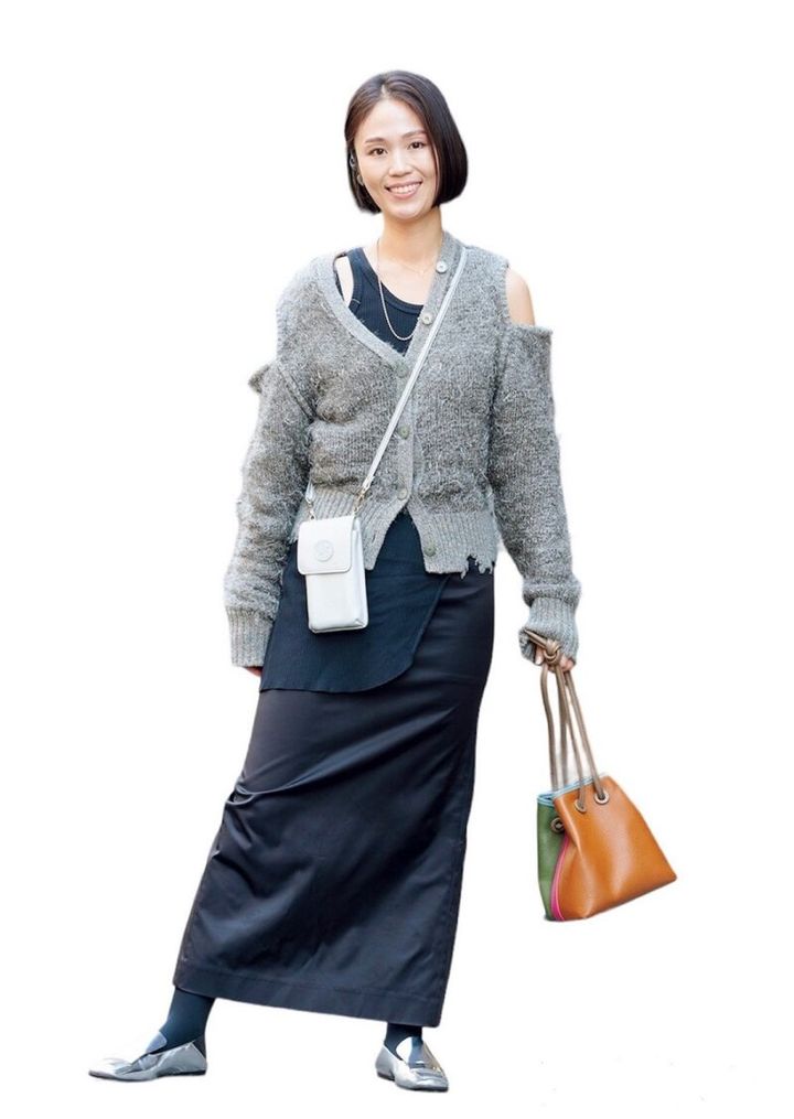 デザインに特徴のあるアイテムは黒やグレーでまとめると上手くいくお手本コーデ。「モノトーンが好きだけれど、真っ黒にならないよう肌見せしつつコーデ。見せる面で印象が変わるマルチカラーのバッグを差し色に」(那須川さん)