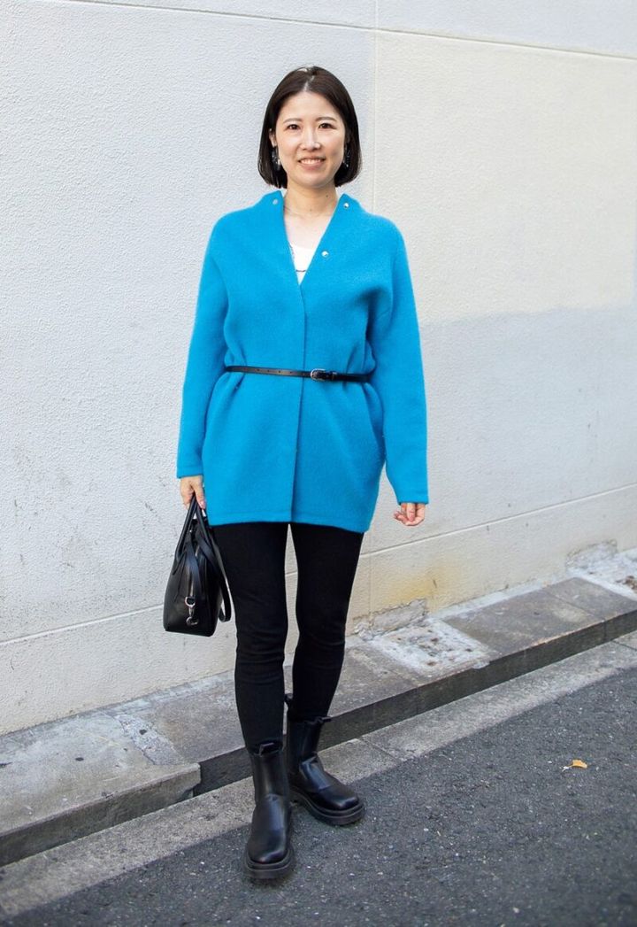 GLOWの読者チーム・かがやき隊の兼原さんは、コートにもなる厚手のニットカーディガン。鮮やかなブルーを活かすために、オールブラックでまとめてすらっとスタイルUP。「腰まですっぽり隠れるロング丈のカーディガンは、ベルトマークでメリハリをつけて」(兼原さん)
