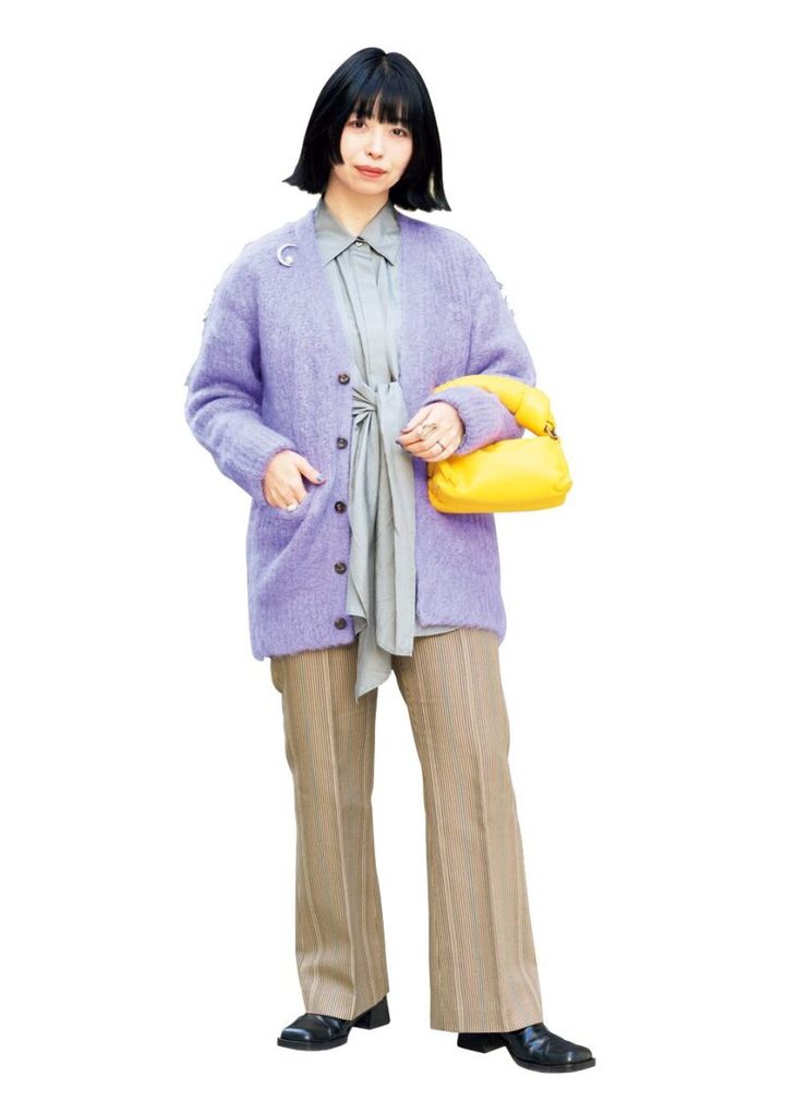 雰囲気のあるニットが人気のジュン ミカミのキッドモヘアのカーディガンをポイントにした砂辺さん。ボタンを開けてシャツとの色合わせを見せるのがバランスがいい。「ざっくり感のあるニットカーデが今日の主役。紫色が映えるよう、おさえめのグレーシャツを合わせて」(砂辺さん)