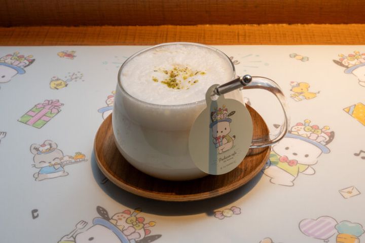 この季節にうれしいホットドリンクもあります。ポチャッコのオリジナルマドラータグはお持ち帰りOK。
