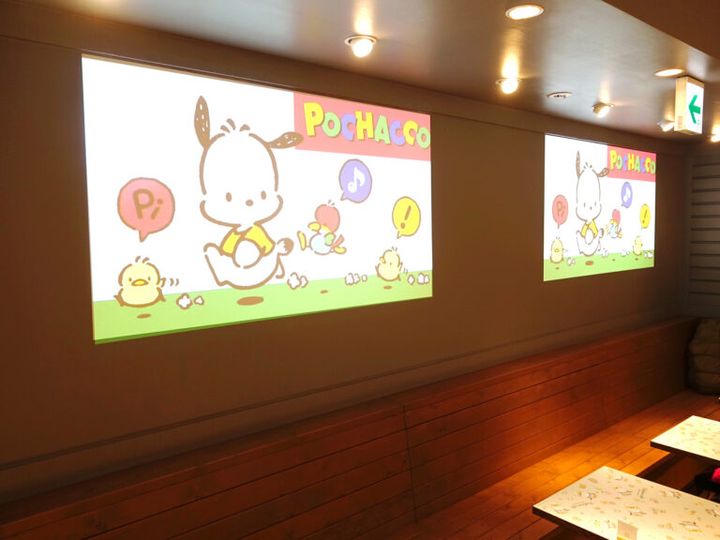 反対側の席にはスクリーンがあり、ポチャッコのイラストやポチャッコからの特別メッセージが流れます。どんな内容かは、会場を訪れた人のお楽しみ