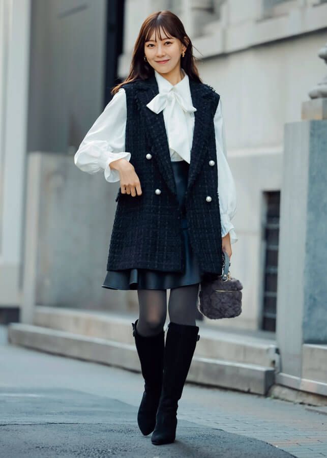 ボウタイ×ツイードジレの鉄板コンビを黒ブーツでアプデ