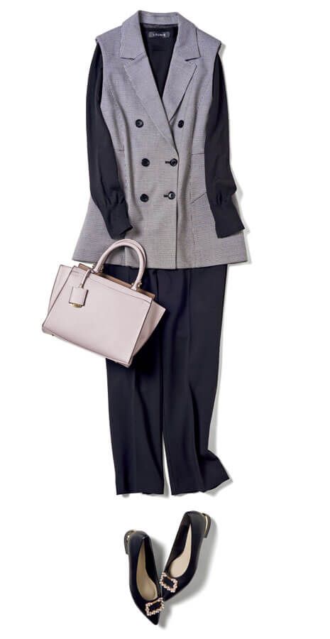 ニット×センタープレスパンツのミニマルなALLブラックコーデに、テーラードデザインが知的なグレーのジレでピリ辛なエッセンスを注入。クールになりすぎないように、バッグでパステルを足しつつ、足元にもきらめきを。