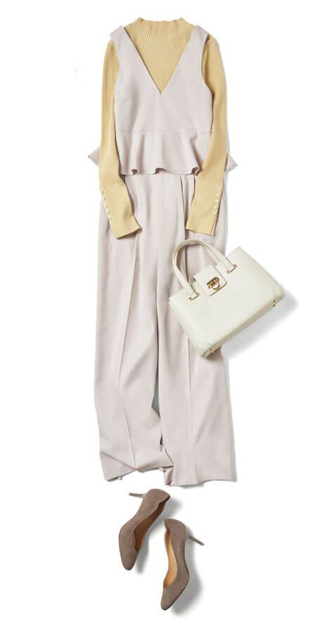 品行方正なベージュセットアップも、トップスがペプラムキャミならこんなにあか抜けた印象に。+イエロー&白で全体を柔和なトーンでまとめることで、親しみやすさをキープ。今年顔なモックネックのリブニットはレイヤードしやすい薄手素材を採用して着膨れの心配なし!
