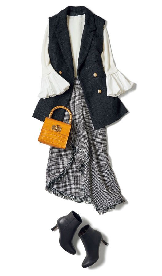 01.ミドル丈のツイードジレで体型カバーと着映えを両立!