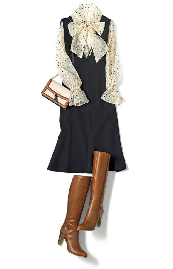 ブラウス&ワンピース¥9,990/クチュール ブローチ(ワールド プレスインフォメーション) バッグ¥39,6 00/ケイト・スペード ニューヨーク(ケイト・スペード カスタマーサービス) 靴¥46,200/ダイアナ(ダイアナ 銀座本店)