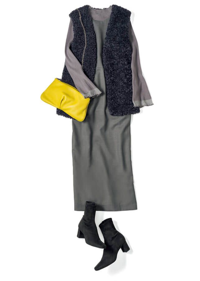 チュールキャミ×ワンピースセット(ワンピースのみ着用)¥25,300/SNIDEL ファーベスト¥24,200/スト ラ ニット¥7,480/NATURAL BEAUTY BASIC バッグ¥38,500/ジャンニ キアリーニ(ジャンニ キアリーニ 銀座店) ショートブーツ¥24,200/ダイアナ(ダイアナ 銀座本店)