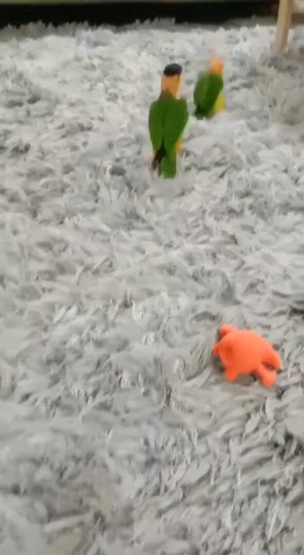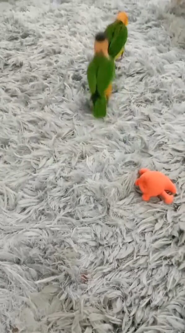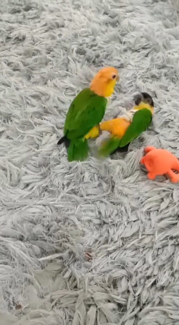 どうやら、カーペットの上で2羽はじゃれついていたようです。