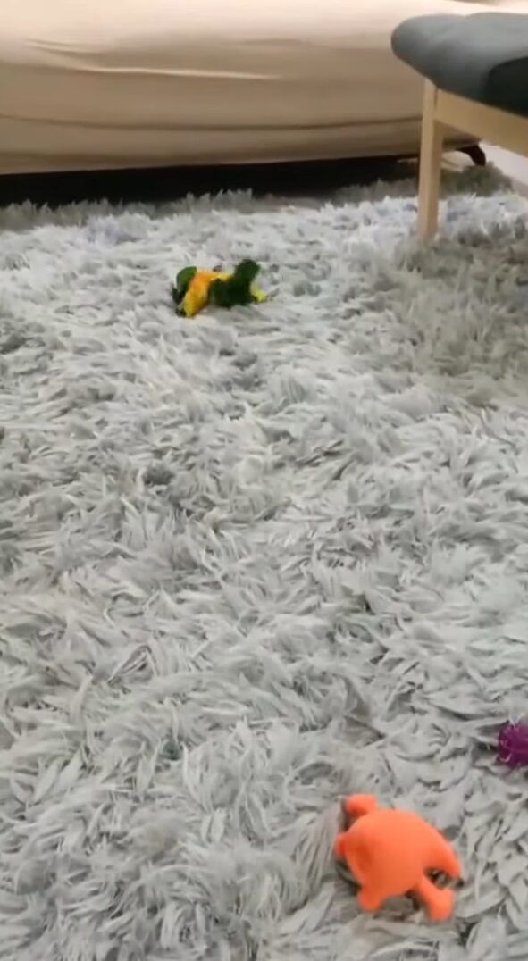 ぴょんぴょんと跳ねながら、カーペットの上で追いかけっこする2羽のインコたち。