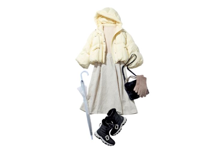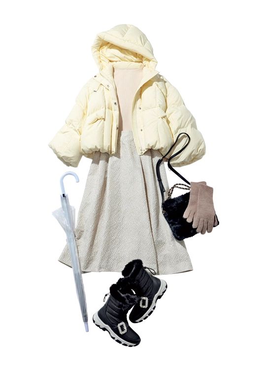 ダウンジャケット¥35,200/FRAY I.D ルミネ新宿2店、チュールスリーブニット¥7,920/NATURAL BEAUTY BASIC、ジャガードスカート¥14,960/ミラ オーウェン ルミネ新宿2店、エコファーバッグ¥13,750/ダイアナ(ダイアナ 銀座本店)、手袋¥1,490/GU、スノーブーツ¥19,800/プラス ダイアナ(ダイアナ 原宿店)、傘/スタイリスト私物