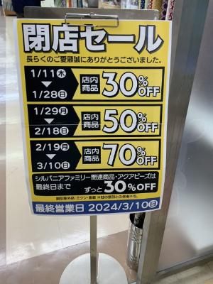 閉店セールが開催されていて、期間を区切って、日にちを追うごとに割引率が上がっていきます。新入園・新入学などで手作りグッズを作ろうと検討されている人は、早めの来店がおすすめかもしれません。アクアビーズなどは最終日までずっと30%オフとのことです。