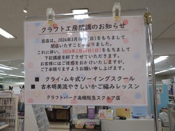 クラフトパークの閉店にともない、こちらの店頭で行われていた「クライ・ムキ式ソーイングスクール」と「古木明美流やさしいかご編みレッスン」の講座も2024年2月18日(日)で終了するとのことでした。