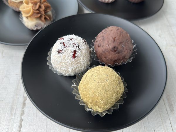 予約購入できるのは、おはぎ「日替わり7種セット」のみ。この日のフレーバーは、粒あん、こしあん、麻の実ときな、ふくじゅそう、コーヒーとデーツ、胡桃味噌のオーブン焼き、ザクロとココナッツでした。皆さんはどれがどれか、わかりますか?