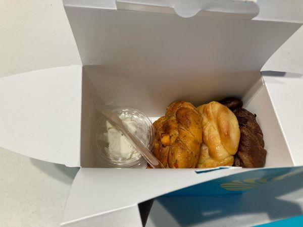 どれも美味しそうで迷ったので、店員さんおすすめチョイス。プレーンを2つ、セミドライトマト&ハーブ、ブロークンチョコレートを一つずつ購入しました。クロワッサンベーグルそのもののお味を楽しめるプレーンと、ブロークンチョコレートは鉄板で、セミドライトマト&ハーブはクリームチーズをディップすると最高とのこと。聞いているだけで美味しそう~~。