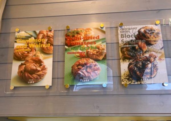 LOOPさんのクロワッサンベーグルは、プレーン(280円)、発酵塩バター(300円)セミドライトマト&ハーブ(330円)、たっぷり黑ゴマ(330円)、シナモンkurumi(360円)、ブロークンチョコレート(360円)の7種類の味から選ぶことができます。