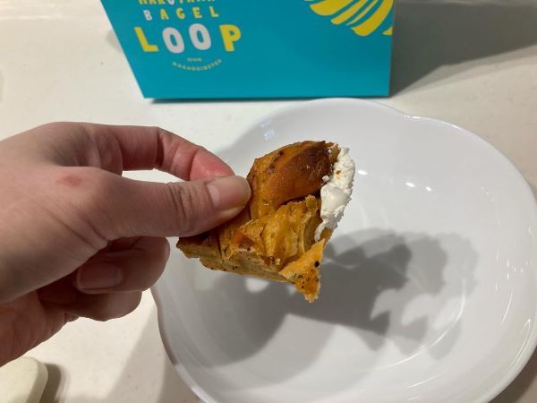 LOOPさんのクロワッサンベーグルは、“⽣乳と⼀緒に⾷べるベーグル”をコンセプトに、北海道産⼩⻨粉をメインに使⽤した、クロワッサン⾵の⽣地を独⾃の⽅法で伸ばし、成形時に捻り を加えて焼き上げているそう。