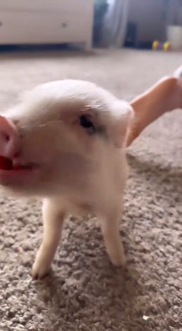 とても賢い子ブタ。 飼い主さんの指示に従ってぐるりとターンしてみせました! そして、ご褒美にイチゴをもらうとさっそくモグモグして機嫌がよさそう!!