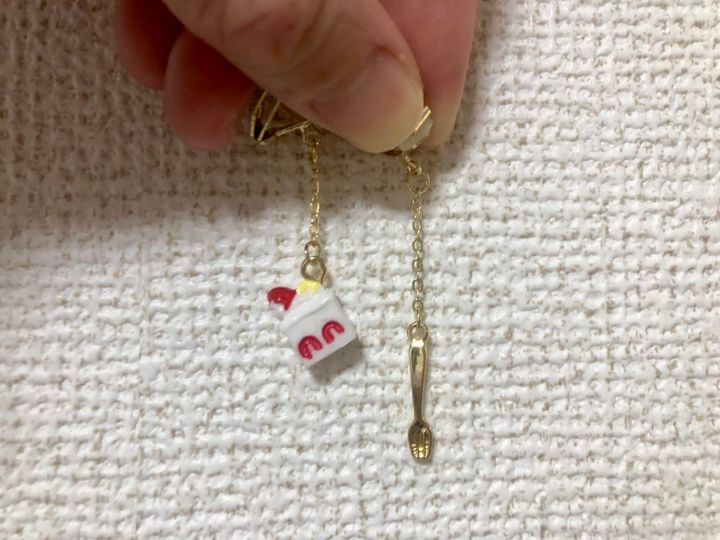 このイヤリングもケーキいちご!いちごケーキ、さりげなくいちごの上にクリームのってるし、反対はフォークでちゃんと両耳で違うし、見つけた時はきゃーとなりました!