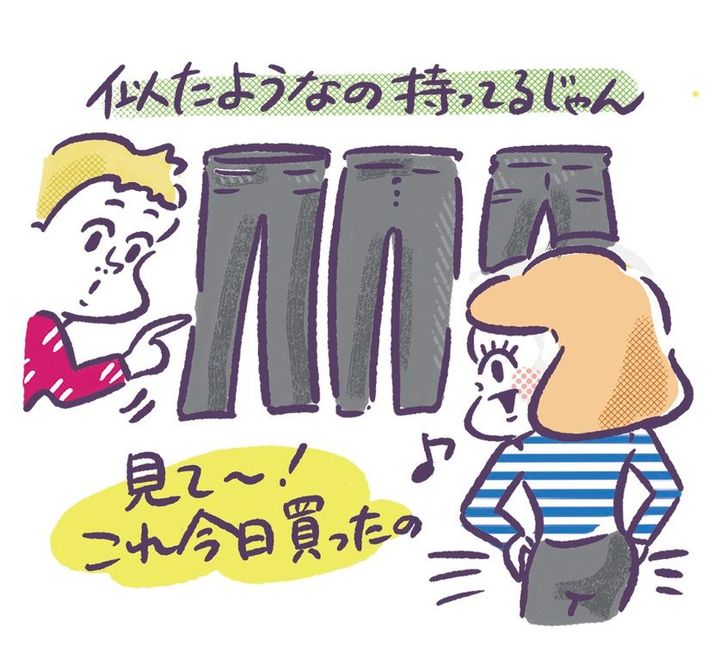 黒パンツは着まわしがきく万能アイテムですが、問題はその数。3 本以上黒いパンツを持っている人は、「便利そう」と思うと、つい買ってしまうタイプ。結局すべてをうまく着こなせず、たんすの肥やし=ムダ買いに。黒パンツ以外でも、クローゼットの中に、同じ色や形のアイテムがいくつもある人は要注意。手持ちの洋服を整理して、似たアイテムは1 着にしぼる、今着ている「1 軍」だけにすると、なんとなく浪費やダブり買いが減らせます。