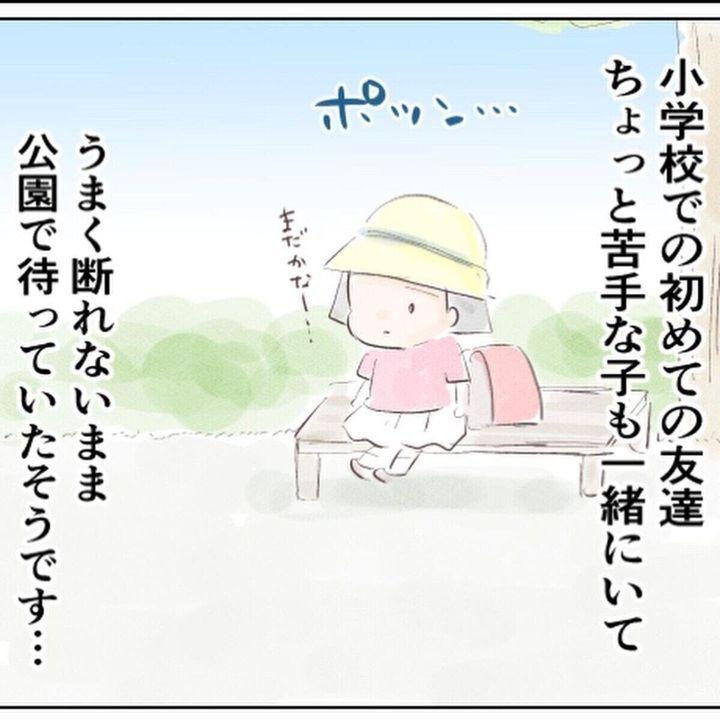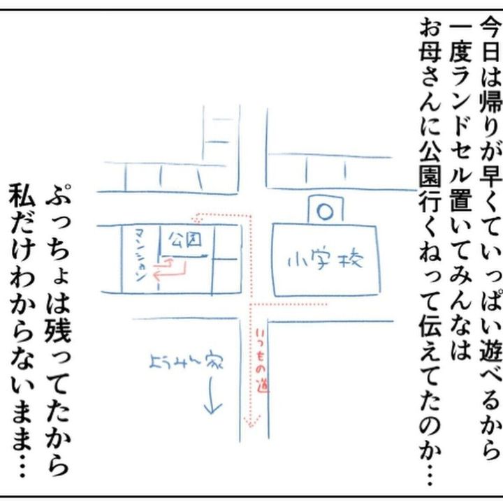 公園に着くとお友だちの3人は、ランドセルを置きにマンションに帰ってしまいました。ぷっちょちゃんはその間、一人で待っていたそうです。ぷっちょちゃんの話を聞いたようみんさん(@mamayoubi)は、ぷっちょちゃんに大切なことを伝えます。『小1の娘が帰ってこない』第13話をごらんください。