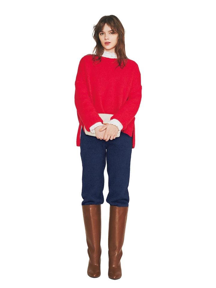 ニットはワイドな身幅にクロップド丈のバランスが旬。サイドスリット入りで、後ろが長いデザインなのでロンTやシャツなどのレイヤードも簡単。目を惹きつける高発色なニットでワンツーでも主役顔。