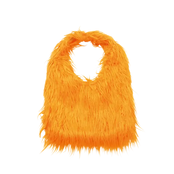 持つと三角形になるモードなシルエット♡ 鮮やかなオレンジと毛足の長いファーがコーデに映える。
