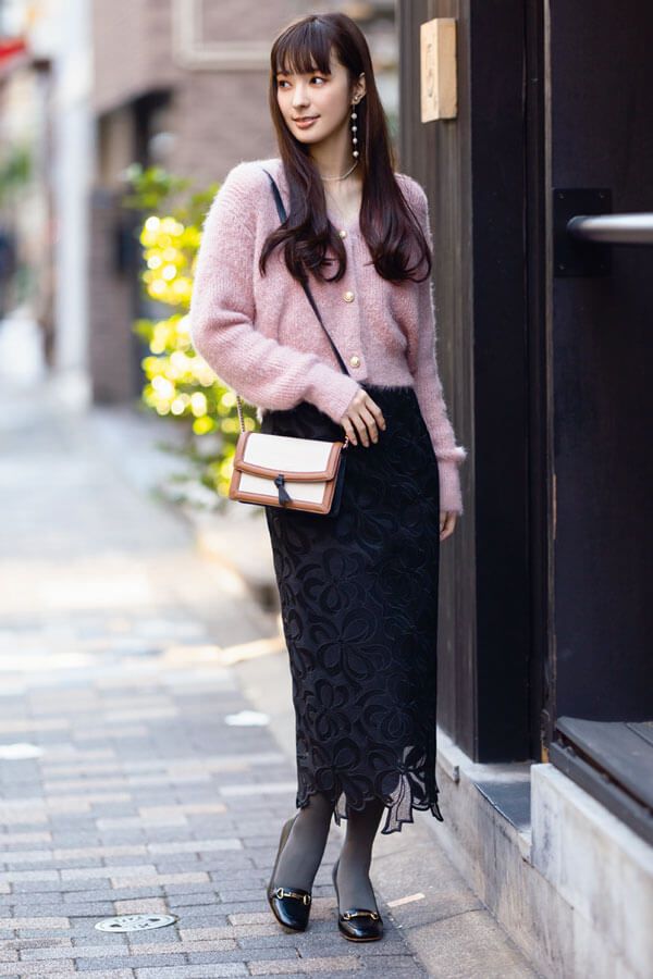 カーディガン¥10,890/Swingle(Swingle 有楽町マルイ店) タイトスカート¥20,900/CELFORD バッグ¥39,600/ケイト・スペード ニューヨーク(ケイト・スペード カスタマーサービス) イヤリング¥4,950/MEX(ロードス) ネックレス¥27,500/ステラハリウッド タイツ¥1,100/満足(福助) パンプス¥19,250/ダイアナ(ダイアナ 銀座本店) 庄司さん分・カーディガン¥3,990、Tシャツ¥1,500/ともにUNIQLO