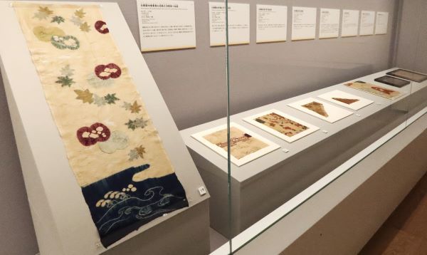 手前、白練緯地檜葉重ね団扇立浪模様小袖裂 桃山時代・16世紀 丸紅株式会社蔵、他、展示風景 丸紅ギャラリー