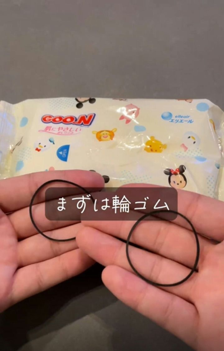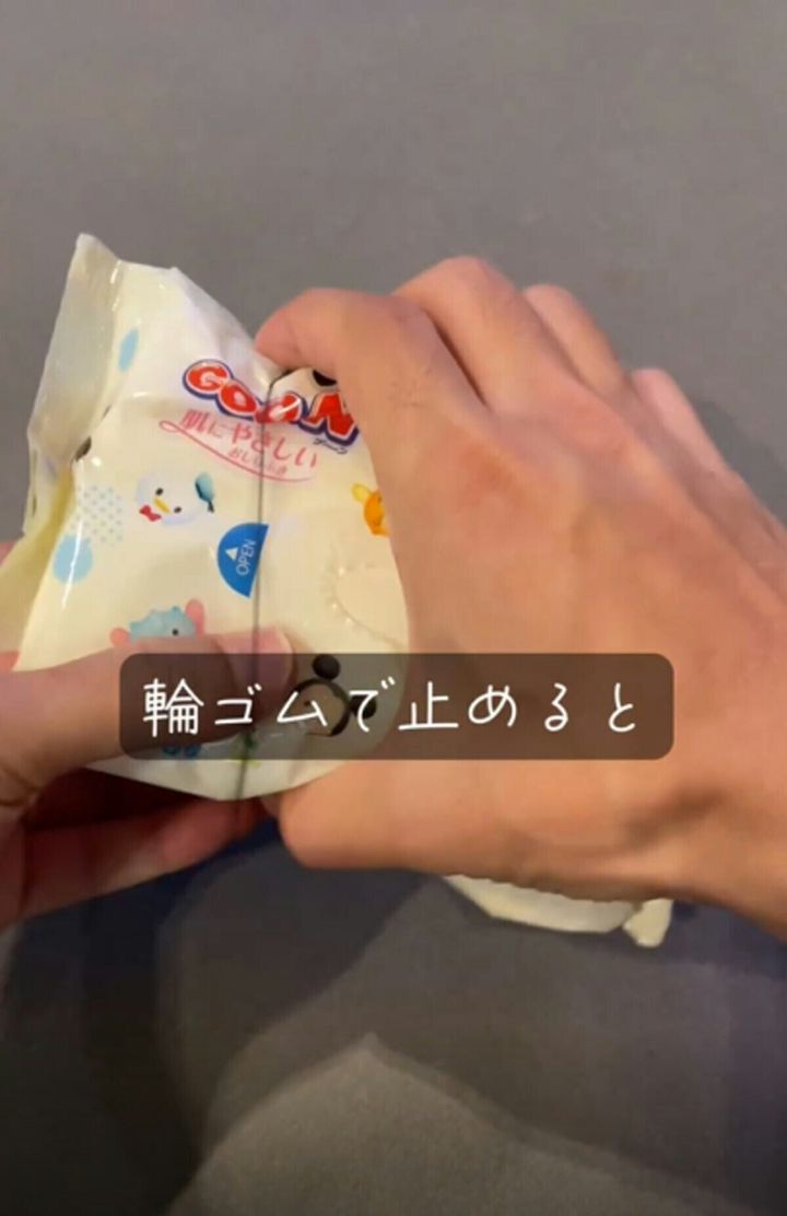 おしり拭きのパッケージの両端を輪ゴムでとめます。