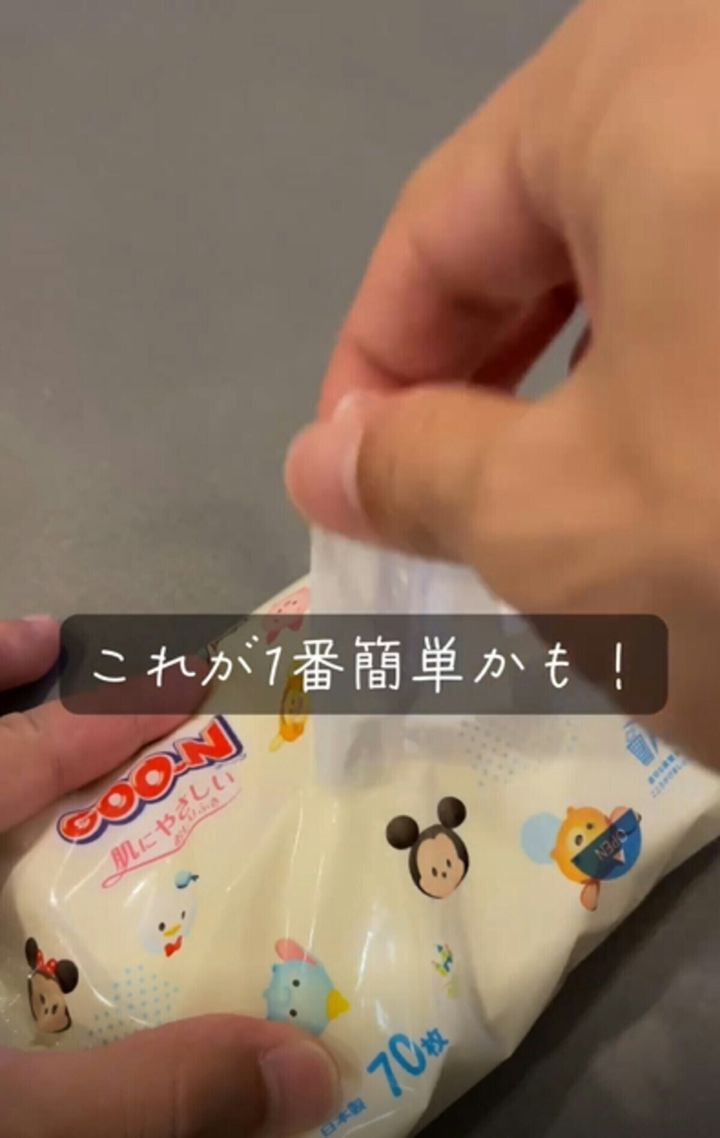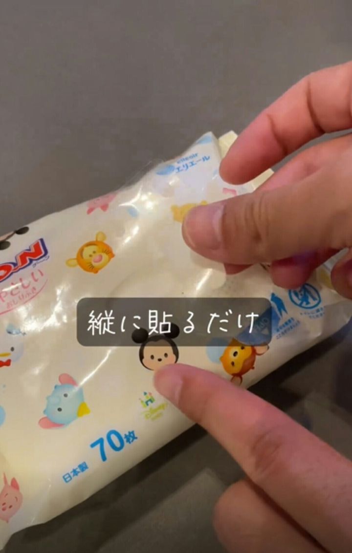 他に何も用意せずとも、たったのこれだけでおしり拭きがスムーズに取り出せるようになります。こまめ夫婦 | 1分でわかるライフハックさんからしても、この方法が1番簡単とのことです。イライラ解消のために「シールを剥がして開封したら、縦に貼る」をしっかり覚えておきましょう。