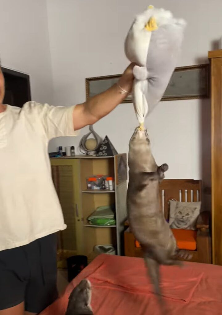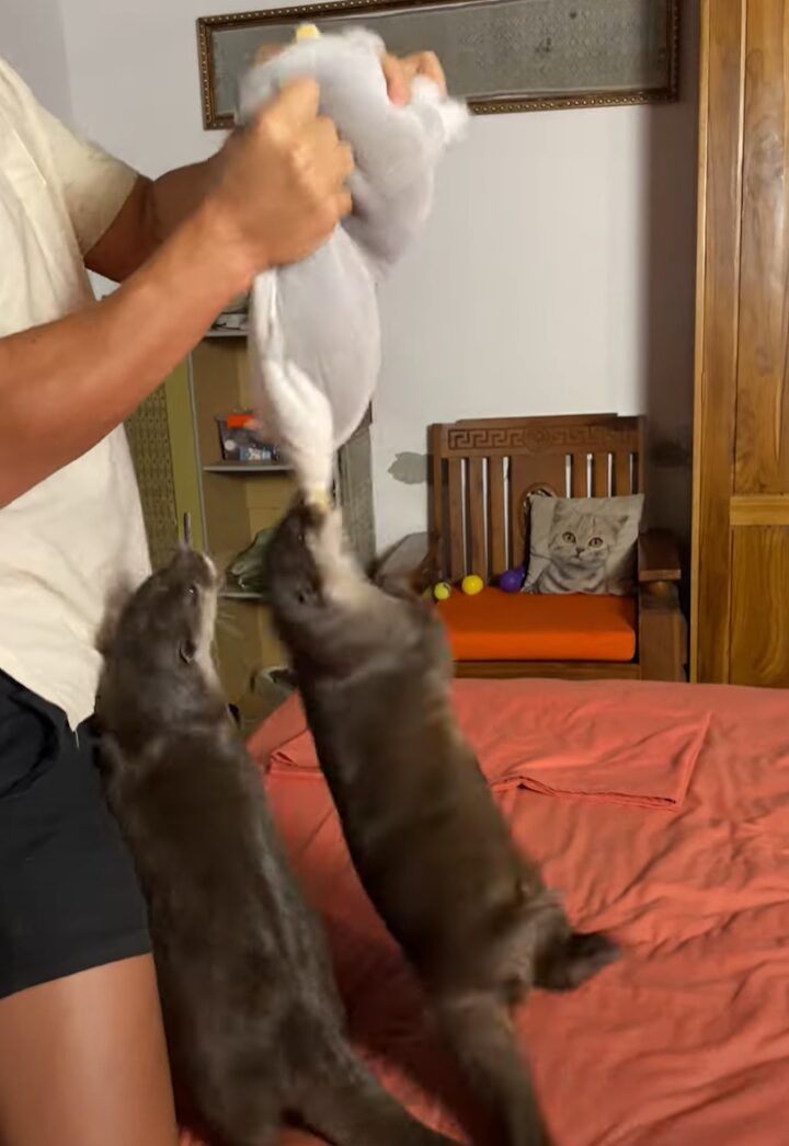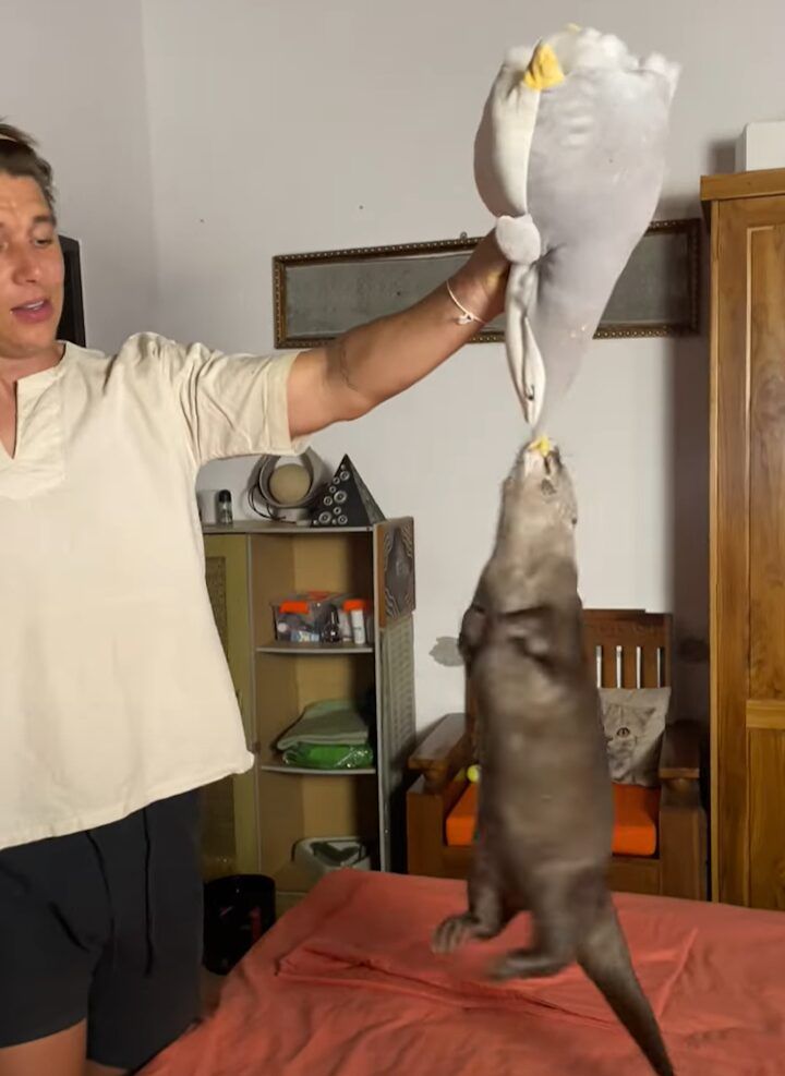 3. 絶対にはなさない!カワウソがくわえたぬいぐるみを飼い主さんが持ち上げたら・・、ぶら下がってグルグル回転!!【海外・動画】