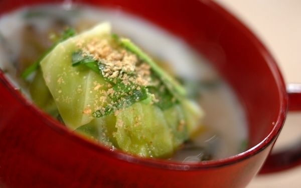 白だしは和風のイメージがありますが、中華スープにもアレンジできますよ。牛乳やゴマ油、すり白ゴマでパイタン風の味わいに。キャベツの甘みと牛乳のまろやかさがやさしい一杯です。