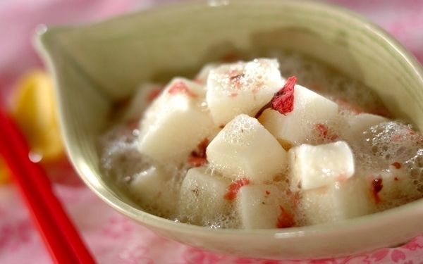 白だしはしょうゆやめんつゆにくらべて色が薄いため、色を活かしたい料理にもってこい。こちらは、長芋と桜の塩漬けを使った和え物です。白とピンクがキレイで、春の食卓にぴったり。卵白はしっかり泡立てず、全体を混ぜる程度にすると口当たり良く仕上がります。