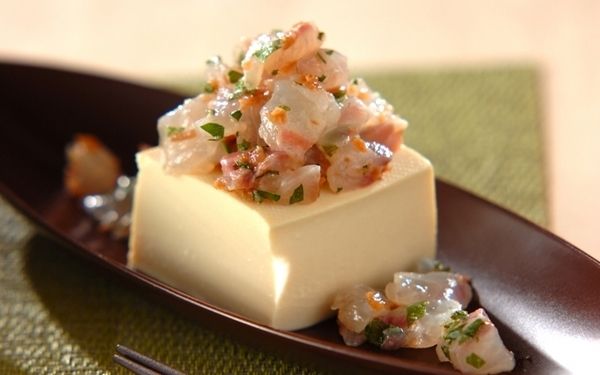 短時間で作れる定番の冷奴。白だしをからめた白身魚をトッピングすると、ワンランク上の味わいを楽しめます。白身魚は鯛やヒラメなどお好みのものでOK。梅肉と白だしの相性も抜群です。