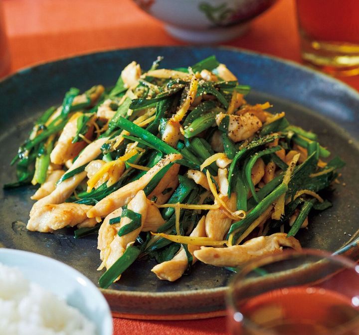 (2)フライパンにサラダ油大さじ1/2を中火で熱し、鶏肉を入れて炒める。色が変わったら砂糖小さじ1、しょうゆ小さじ2を加えてからめる。にら、しょうがを加えてさっと炒め合わせる。器に盛り、粗びき黒こしょう適宜をふる。
