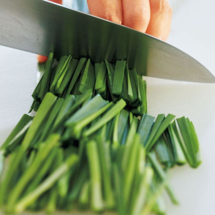 (1)にらは長さ4cmに切る。しょうがはせん切りにする。鶏肉は7~8mm角の棒状に切り、下味の材料を順にもみ込む。