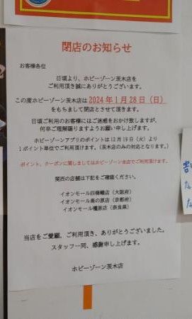 3階では、パズルやプラモデルの関連グッズ、フィギュアなど販売していた「Hobby Zone(ホビーゾーン)茨木店」も1月28日(日)に閉店しています。