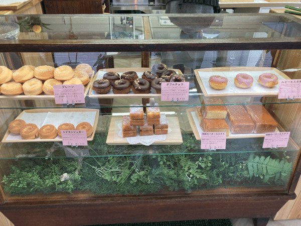 米粉で作られたドーナツです。この日はプレーン、シナモンシュガー、ダブルチョコ、ルビーピスタチオのラインナップでショーケースに並んでいました。