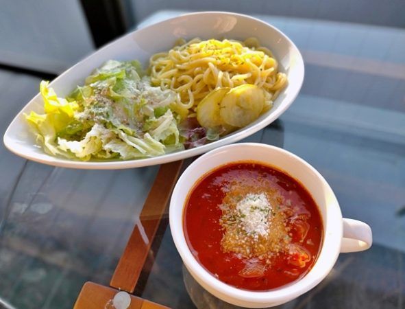 この日は控えめな夕焼けでしたが、お天気次第では、この窓から真っ赤な絶景が眺められるとのこと。 また、週末(金・土曜)限定のバー営業では、アルコールを含むドリンク1杯+少しずつ色々なおつまみを盛り合わせた前菜プレート(チャージ込み1,500円)が人気です。観光で歩き回って疲れたら、ソファー席でまったりお酒を楽しんで帰るのも素敵ではないでしょうか。