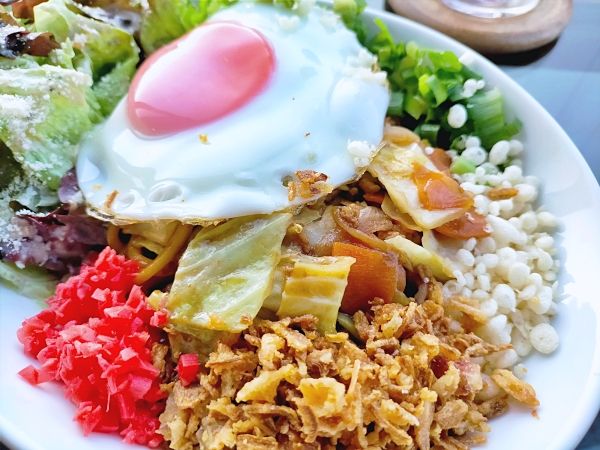 サラダを添えて「カフェ クレセント」風にアレンジされた「川越太麺焼きそば」は、ソースの香りが食欲をそそります。 私は目玉焼きのせにしてもらいましたが、生卵をチョイスして麺を絡める「すき焼き風」の食べ方もおススメなのだそう。