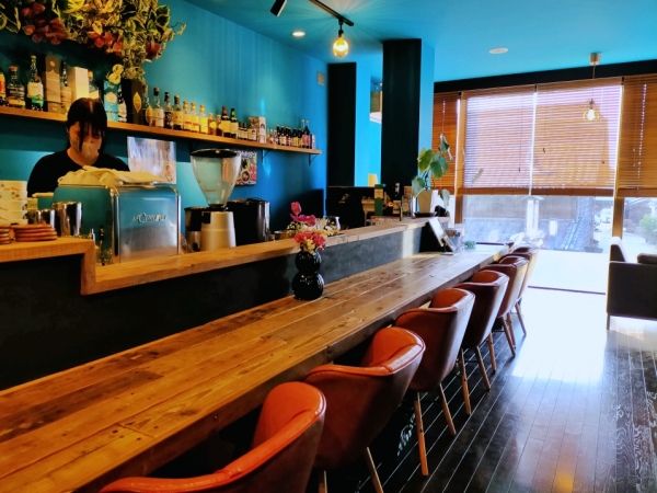 入口を入ると、メインカラーの神秘的なブルーが、何とも言えず癒される雰囲気の店内。 座り心地の良さそうなカウンター席が並んでいます。