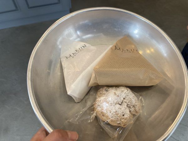 看板メニューのMARUN(どら焼き)とスコーン(冬季限定のシュトーレンみたいなスコーン)です。MARUNは甘さ控えめの餡子が入っておりますが、ほどよい甘さで美味しくいただきました。スコーンはお酒が入っていたので私と子供は食べれず、夫にあげてしまったので詳しい味はわかりませんが、美味しくいただいたようで、紅茶やコーヒーと合うようでした。