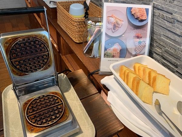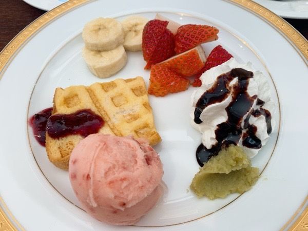 私はフレンチトーストワッフルを焼き、トッピングをカスタマイズ。いちごのシャーベットも添えてみました。