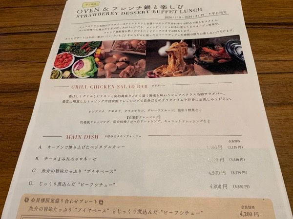 平日限定の「OVEN &フレンチ鍋と楽しむ STRAWBERRY DESSERT BUFFET LUNCH」は、サラダバーとストロベリーデザートブッフェ付き。メインディッシュも選べます。