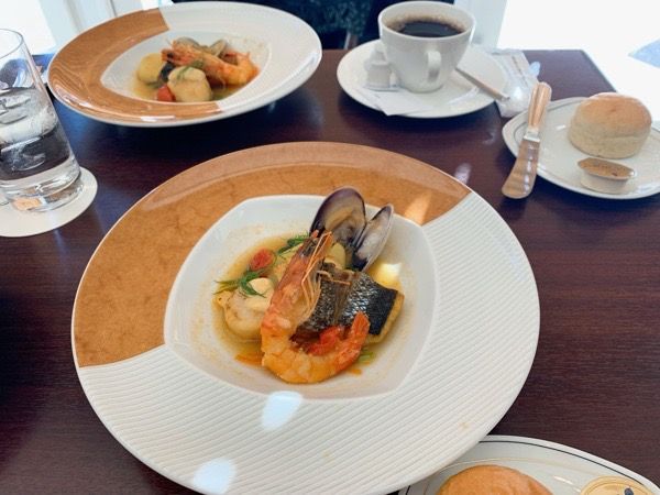 メインディッシュで選んだ「魚介の旨味たっぷりブイヤベース」が登場。魚介のいい香りが漂います。
