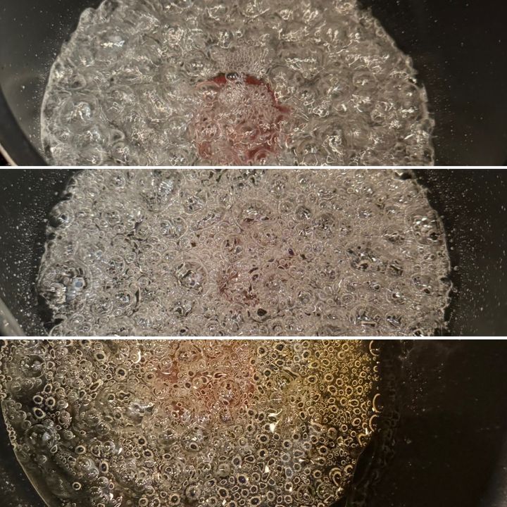 分量は、砂糖180g、水135mlで、最初は中火ですると、今までの失敗はなんだったんだ!というくらい、スムーズに飴色になりました!わが家の環境では10分では足りず、12分ほど鍋に火を入れていました。飴色になってからは弱火に。