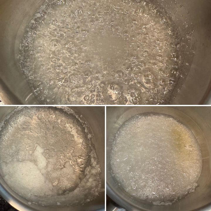 翌日、1度目の分量の半量でリベンジしました。火にかける前も一切混ぜず。半量だったので、5分ほど経過したら、鍋の表面に薄い膜が張ったような状態になり、再び砂糖が固まり始めました、、、火を切ると、あっという間に結晶化して、ジャリジャリに。フルーツをつける間もなく失敗となりました、、、