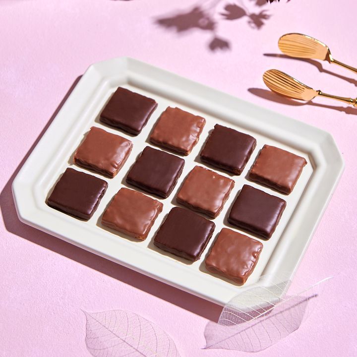 ビターとミルクの2つのチョコレートでコーティングされた王道のお菓子「サブレ オ ショコラ」。薄く焼き上げられているサブレには、ブルターニュ地方の名物であるクレープをしこんであるので、軽い口当たりが特徴的。さらに程よい塩気も効いているから、つい手が止まらなってしまうほどの美味しさなのだとか!