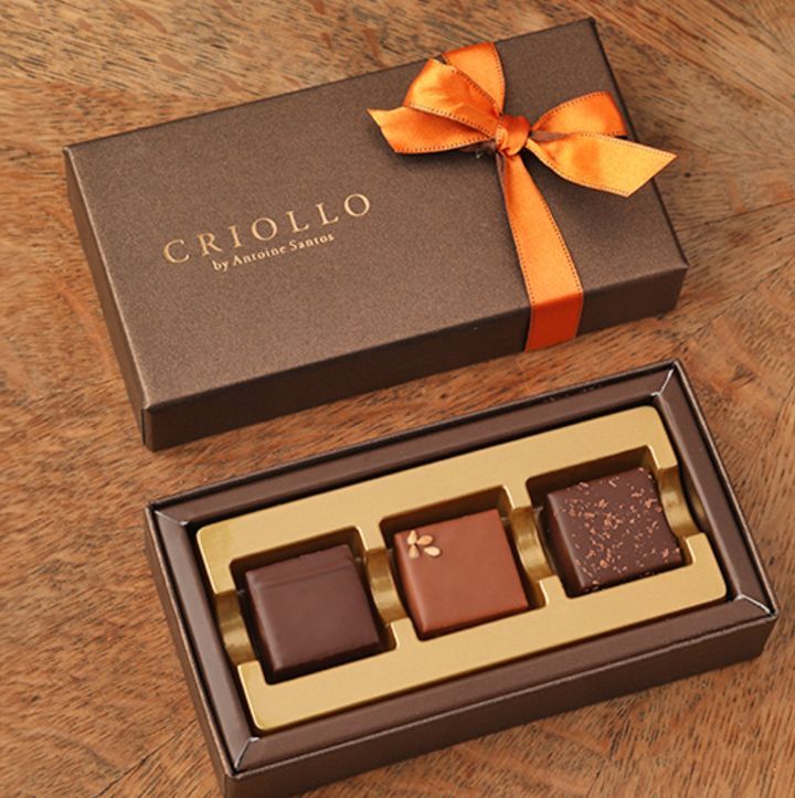 フランス人パティシエ「サントス・アントワーヌ」のパティスリー「クリオロ」から阪急うめだ本店限定で販売されるのは、サントスシェフが得意とするキャラメルを使用したセット。ヘーゼルナッツがポイントになっている「キャラメル・ノワゼット」「キャラメル・セザム」、C.C.C.の品評会で金賞を受賞したキャラメルとヴァニラのボンボンショコラを正方形にアレンジしたという「キャラメル・ヴァニーユ」の3粒が楽しめる一箱となっているそうです。