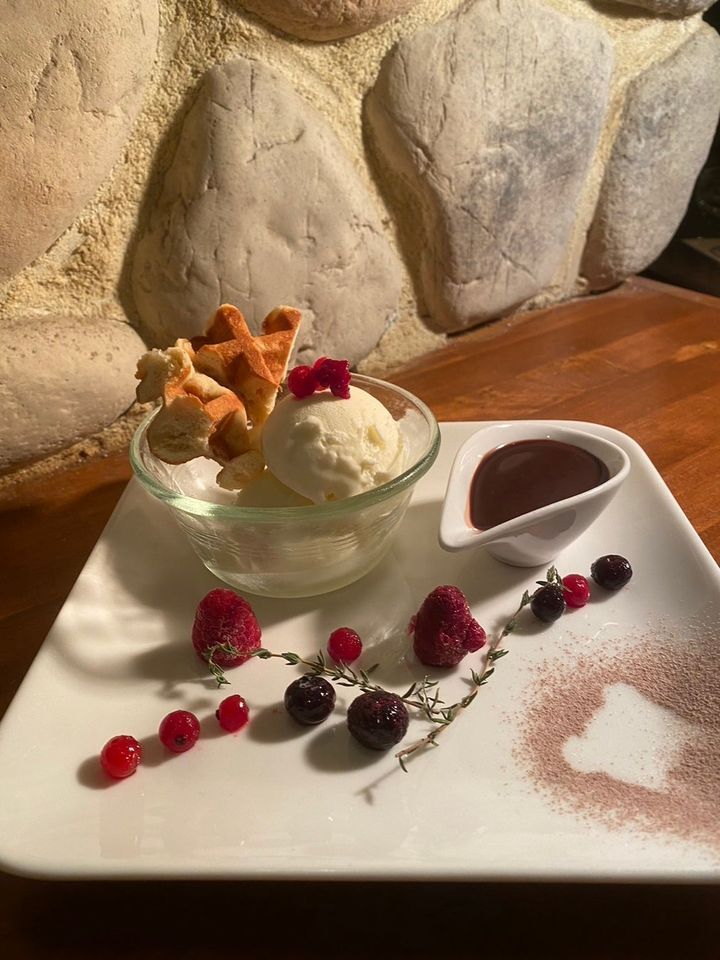 「旧居留地バレンタイン」では、旧居留地エリア周辺にある飲食店で「バレンタイン限定メニュー」が提供されます(提供期間は2024年1月24日(水)〜2024年2月14日(水))。なかでも注目したいのは、浪花町筋に面したところにある「Cafe Rest8番館」。こちらでは食後にぴったりなバレンタインスイーツを用意しています。ベリーとワッフルがトッピングされたアイスクリームにお好みでチョコレートを後がけしていただきますよ♡